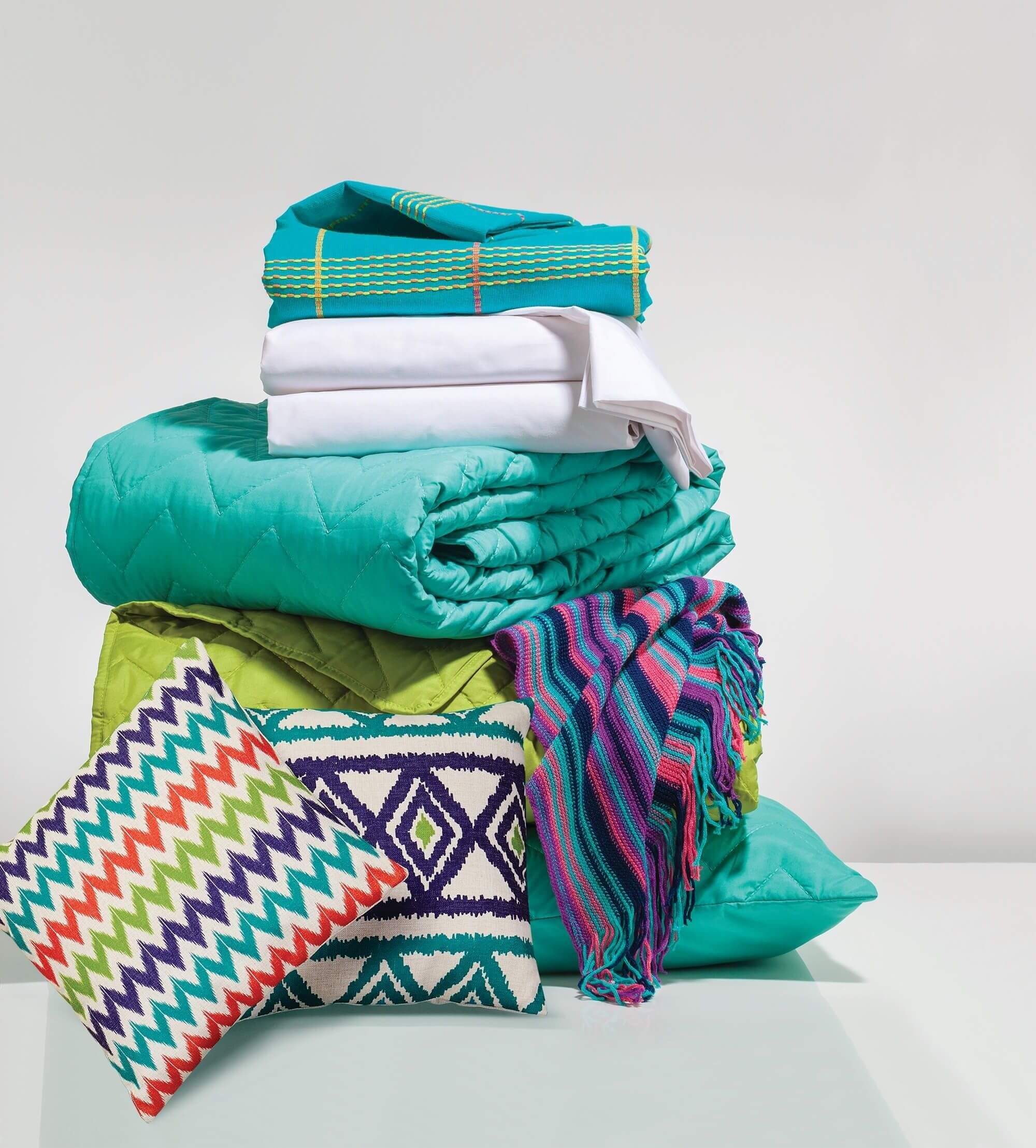 Finished goods like table mats, runners, coasters, pot holder, aprons, napkins, table covers, tea-cosy, kitchen towels, mitts, cushions & covers, bed spreads, bath towels, throws pillow cases, quilts, floor rugs, curtains etc..